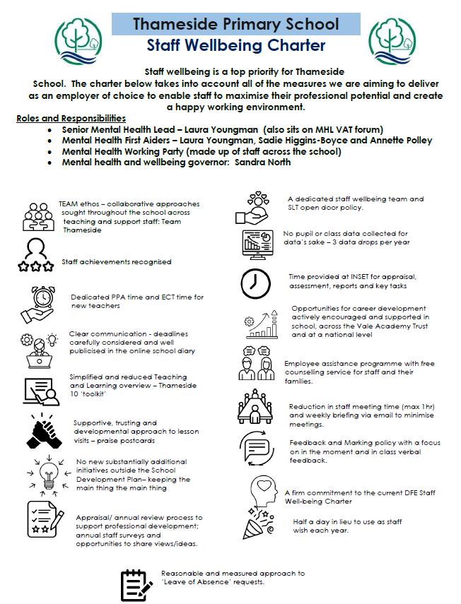 At Thameside Primary School we value all of our staff and believe that having a healthy team is essential for the effective running of the school and the education we provide to our children - we are committed to ensuring that staff feel happy, supported and valued. We understand the importance of providing a comprehensive Staff Wellbeing Offer for all our staff to access to support them and their wellbeing.