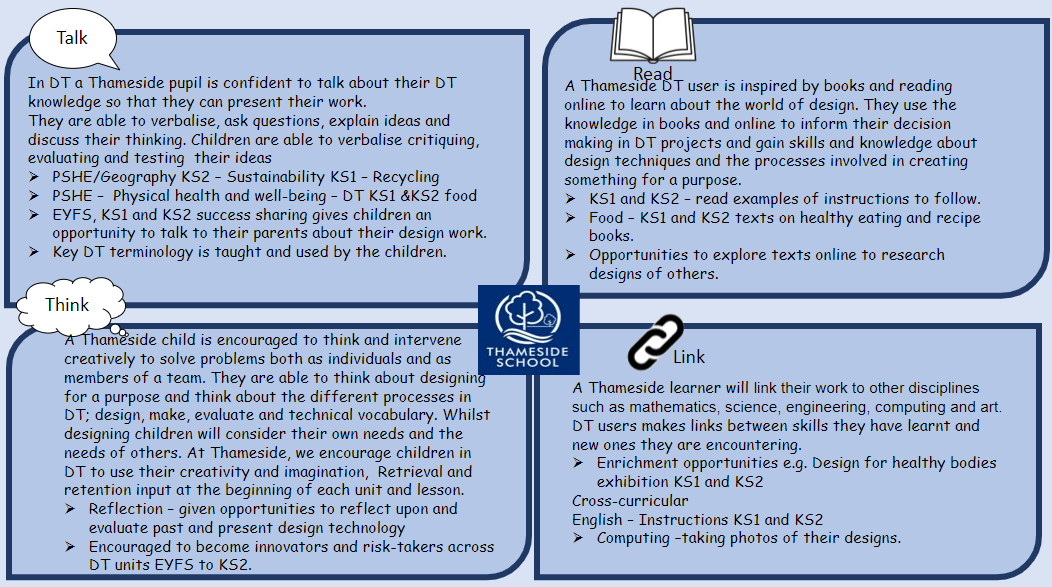At Thameside Primary School, our Design and Technology Curriculum provides opportunities for children to be analytical thinkers, and become, designers and producers of purposeful products that will be used in real-life contexts. Children are encouraged to think and intervene creatively to solve problems both as individuals and collaboratively as part of a team.