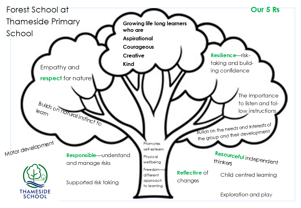 As part of our wider curriculum vision, we aim to foster a love and respect of nature and the environment, as well as developing our children's knowledge of how they can look after the environment. Forest school is a place where children can develop holistically through regular experiences in a woodland environment or natural environment with trees, growing their own confidence; developing positive relationships with peers and an understanding of the world around them. During forest school sessions, children are encouraged to assess and take risks in a safe, supportive way and in line with our Thameside vision, become independent learners, who are creative and kind.