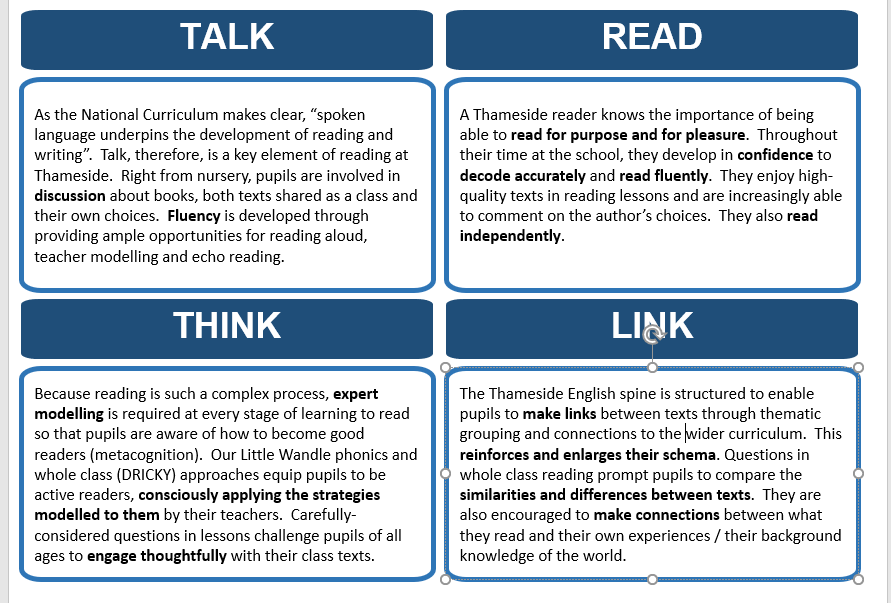 At Thameside, we recognise that reading is the master skill and are focussed on supporting children to be effective 'readers'.  Our vision is therefore that every pupil will become a competent reader so that they can achieve well academically, flourish personally and function effectively in the wider world.
